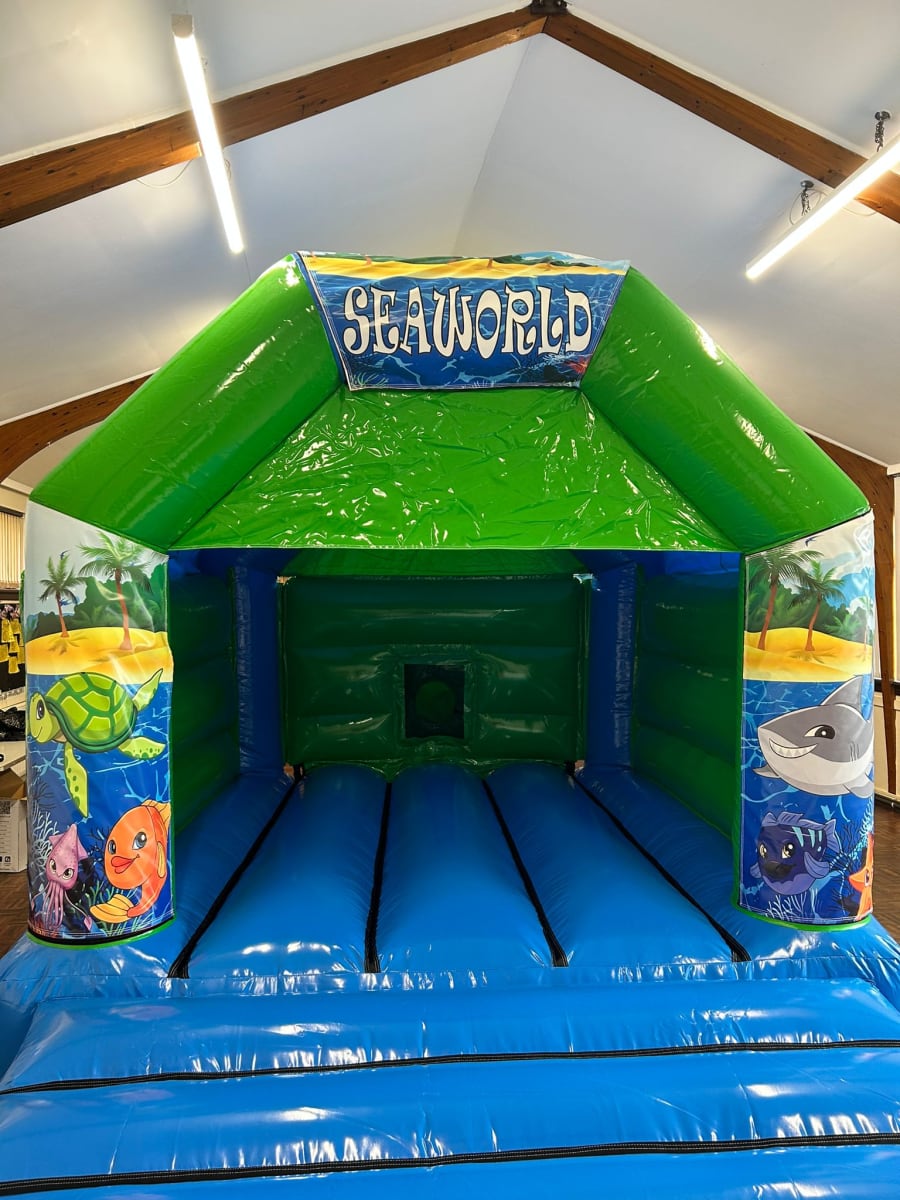Let us help you shellabrate your underwater explorers in style with this Under the Sea theme artwork. This artwork pairs great with our blue and green A-frame bouncy castle.