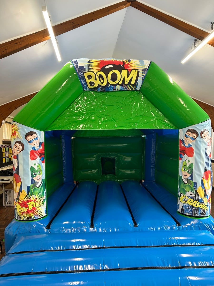 Is it a bird? Is it a plane? No, it’s super-host! With our superhero themed art, you can bring the pow, pow to every party! This artwork pairs great with our multicolour A-frame bouncy castle.